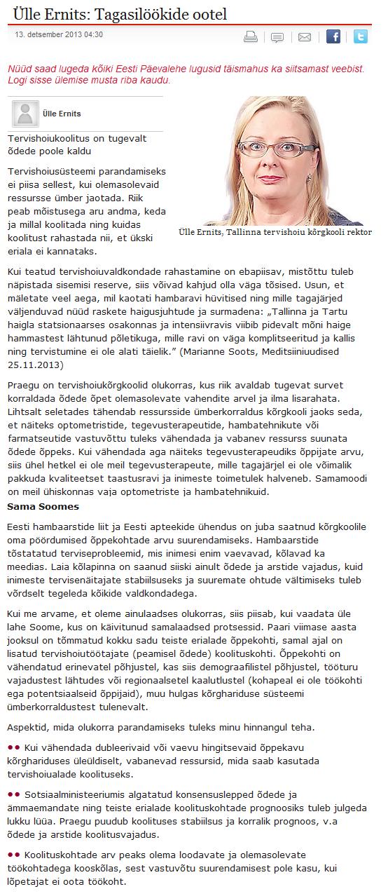Ülle Ernits: Tagasilöökide ootel (Eesti Päevaleht)