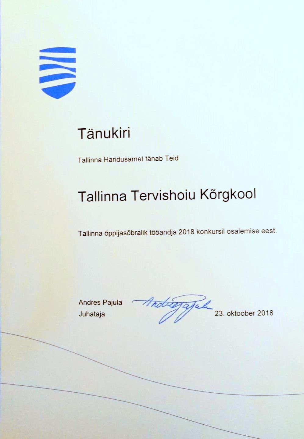23. oktoobril 2018. a Tallinna Raekojas toimunud Tallinna Haridusameti tunnustusüritusel tunnustati "Tallinna Täiskasvanud Õppija Nädala" raames konkursile esitatud nominente.
