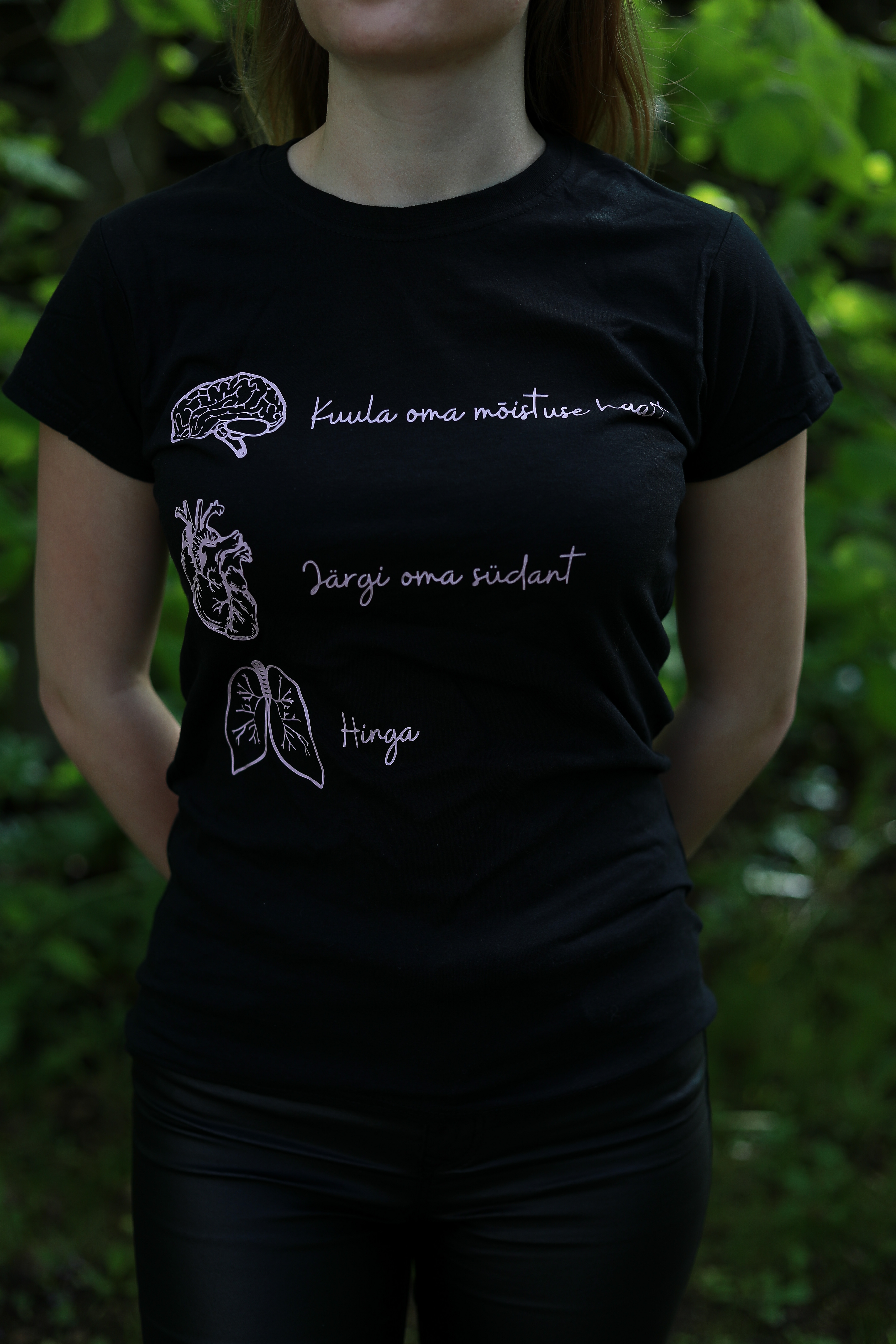 Must T-särk, roosa kirjaga, "Kuula, järgi, hinga" 14.00 EUR