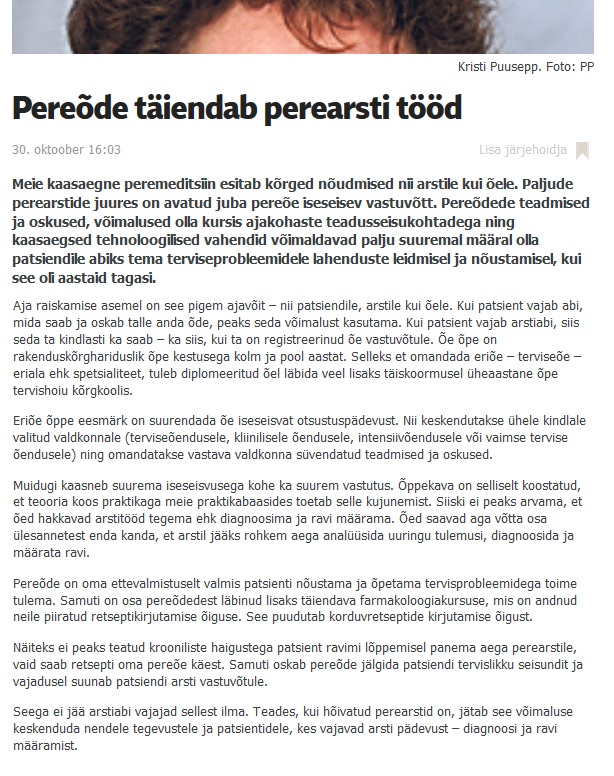 Pereõde täiendab perearsti tööd (Postimees) 30.10.2014